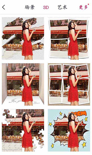 5、这个时候就已经基本大功告成了,如图,已经达成我要的拼图效果,这时候如果想要其他的效果,可以左右滑动图片底部的菜单进行选取,点击更多可以获取更多效果。