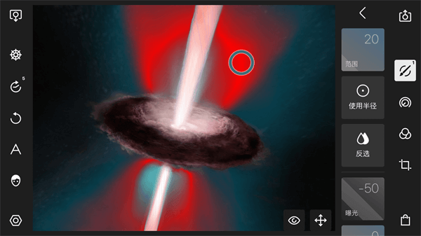 利用笔刷功能,可以手动绘制调整区域,所有的调整只会影响到这些区域。当选中笔刷工具之后,可以使用手指绘制一个区域,在绘制过程中,会有一个红色的区域出现,这些区域就表示被选中的区域。