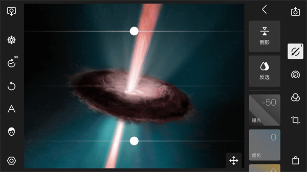 • 全局调整:光效,色彩,HSL,曲线,光感,质感,特效,偏移,染色,色调,色散,暗角,噪点,LUT