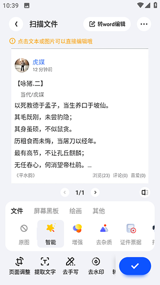 - 提取文字,精准识别图片文本,支持逐字或按段落自由选择复制,还原排版转Word在线编辑。