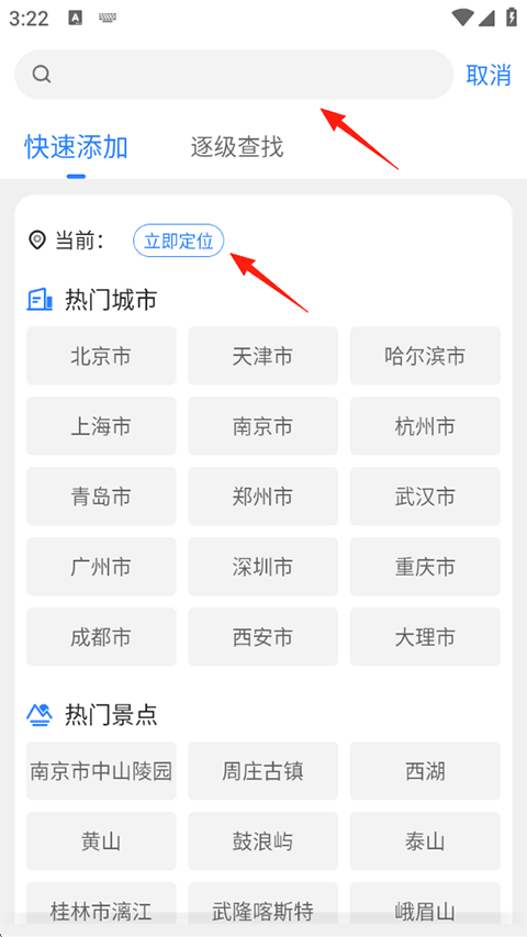 2、随后在搜索框中搜索您想要关注天气的城市,或者在下方滑动手动寻找,还支持热门景点天气查询;