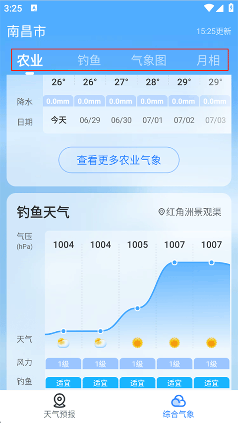 5、最后点击右侧的综合天气,这里有关于农业、钓鱼、气象图以及月相等各种有意思的天气、气象信息,以满足不同用户的不同需求。