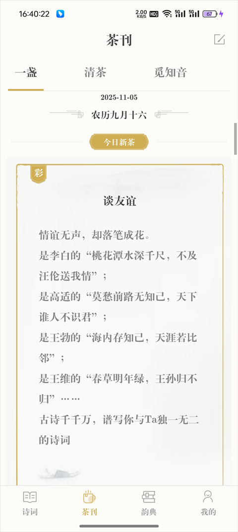 每日更新诗词相关专题、文化随笔、名家赏析和茶文化文章,让用户在品读古诗的同时感受东方意境之美。