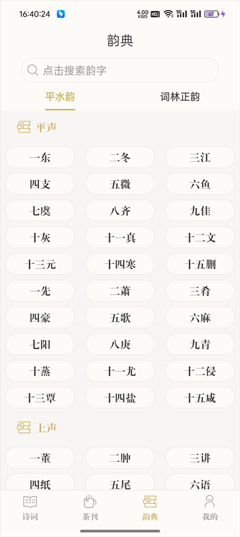 韵典模块聚焦古汉语知识学习,收录常用诗词格律、押韵规律、平仄对仗等知识。