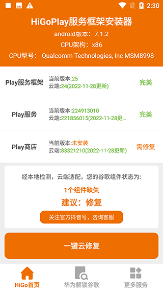2、当我们的 谷歌三件套 没有全部显示完美的时候,我们只需要点击首页底部的一键云修复即可。