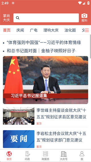 1、新闻媒体阅读,包括头条、新闻、 党建 、看报、视频、视界、直播等频道,宣传党的政策、方针,及时播报国内热点、本地资讯。其中看报展现了大庆日报、大庆晚报的数字报,直播是主要对一些会议、比赛等进行直播。