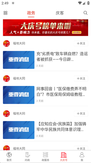 两大板块分为政务和庆客栏目,展示政务资讯及各类官方账号动态内容。