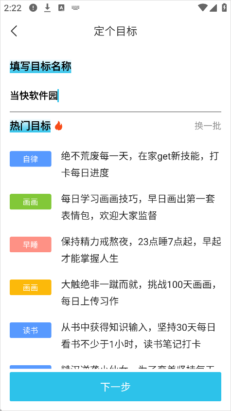 专注目标管理,你可以用达目标发起一个目标计划进行打卡签到,比如早睡早起,日程管理,坚持跑步, 背单词 ,考研,减肥 健身 ,戒烟,坚持背单词,画画,写字,每天记账,战胜拖延症,戒王者荣耀,少逛淘宝,不玩手机,每天学习, 喝水提醒 ,仰卧起坐,学习监督,成为学霸,时间管理,安排任务计划等等,也可以同时发起多个目标进行签到打卡。