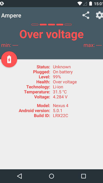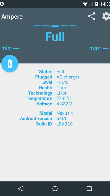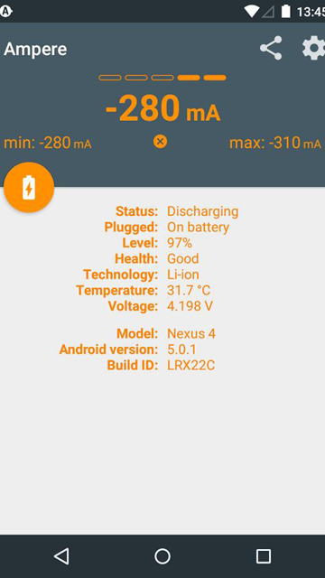 这个应用可以在Android 4.0.3+的设备上工作。并不是所有的设备都可以支持,因为那些设备缺少相应的测量芯片(或接入点)因此它们将完全不能支持。打开应用之后稍等待10秒左右(屏幕上会显示“评测中(measuring)”)。在这段时间之后,充电和放电情况即可显示。