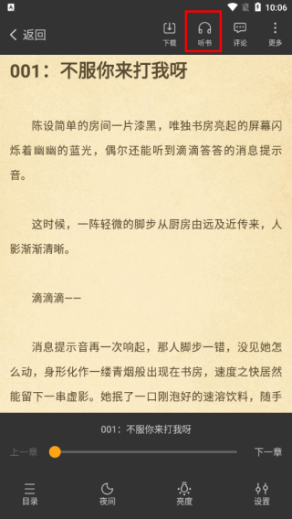 1、选择要听的小说进入,找到听书(需下载并选定 TTS语音引擎 )。